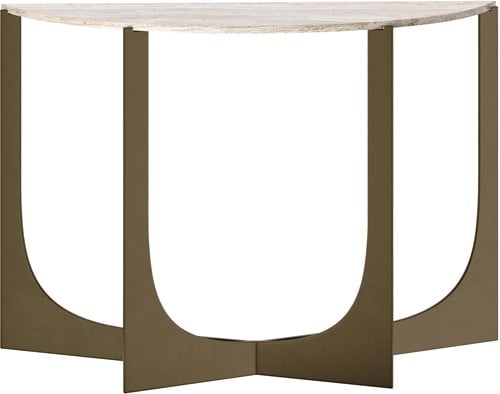 Het blad rust op een stevig roestvrijstalen frame dat is afgewerkt met een prachtige geborsteld bronzen coating. Deze combinatie van natuurlijke steen en warme metaalaccenten geeft de console tafel een tijdloze en luxueuze uitstraling.