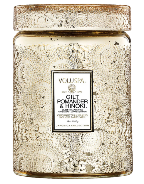De Voluspa Gilt Pomander & Hinoki Large Jar Candle omhult je interieur met warme tonen van gekruide pomander, hulstbessen en Japanse hinoki. Een weelderige geur die sfeer, luxe en comfort brengt in elke ruimte.