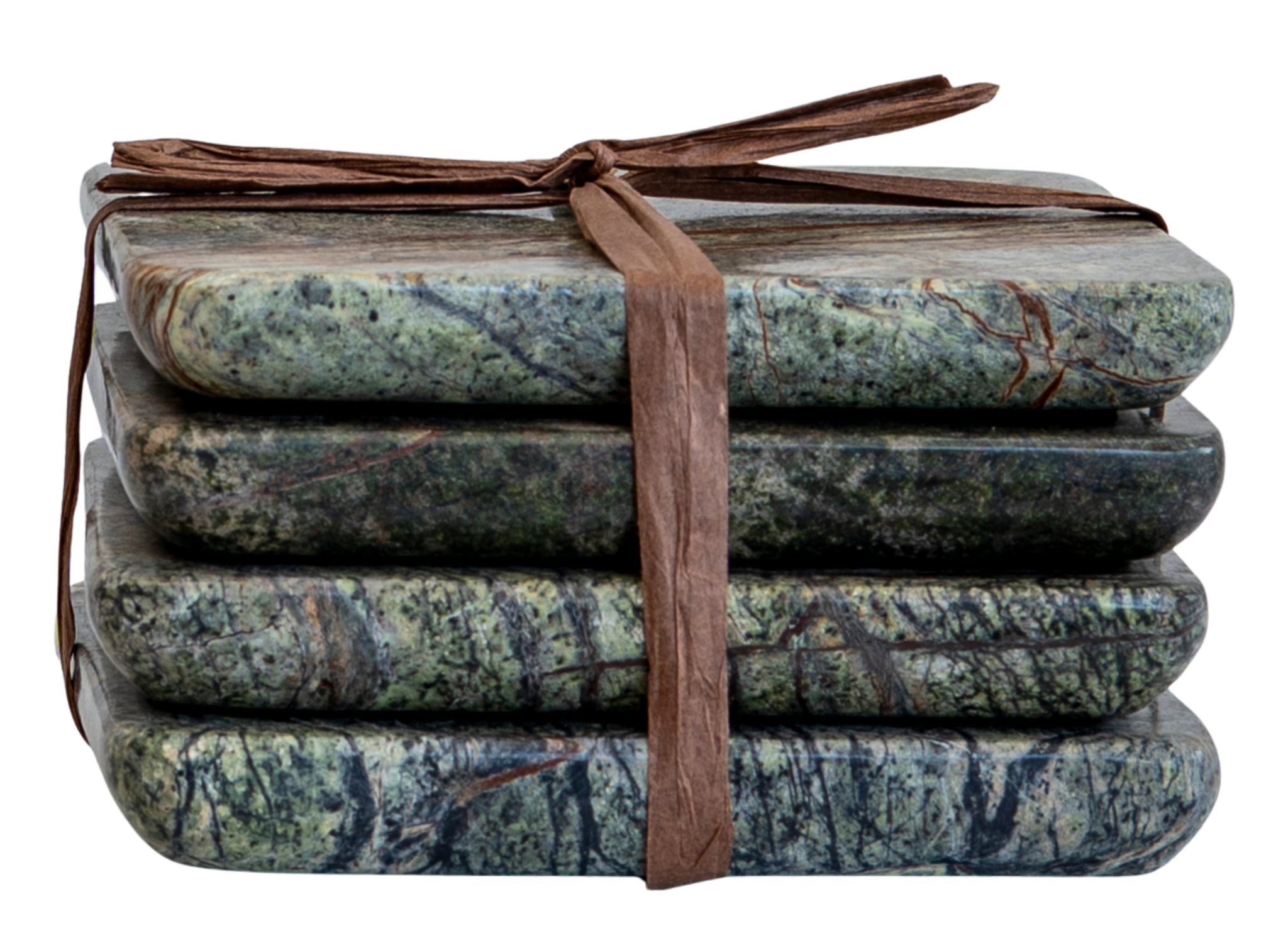 Groene marmeren onderzetters met unieke aders. Functioneel en stijlvol, beschermen meubels tegen kringen en voegen een luxe accent toe aan elk interieur.