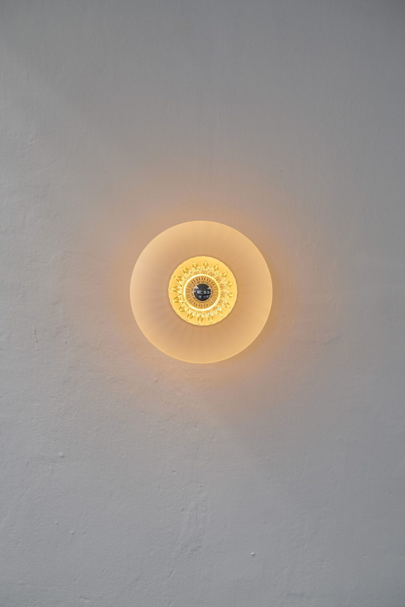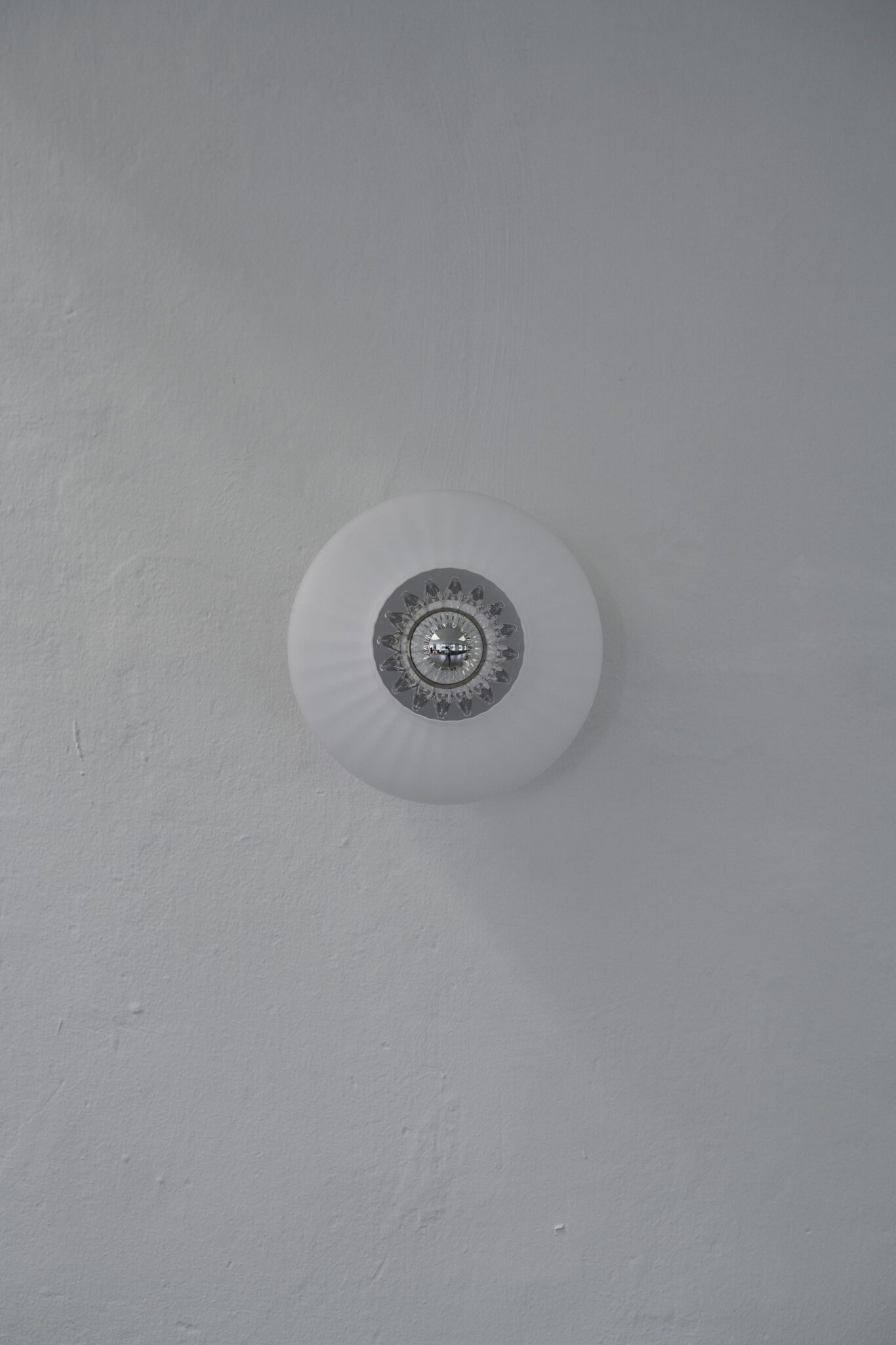 De New Wave Optic Wall Opal is een iconische wand- en plafondlamp van mondgeblazen opaalglas met een witte basis en zilveren rand. Voorzien van 2 meter witte textielkabel met schakelaar.