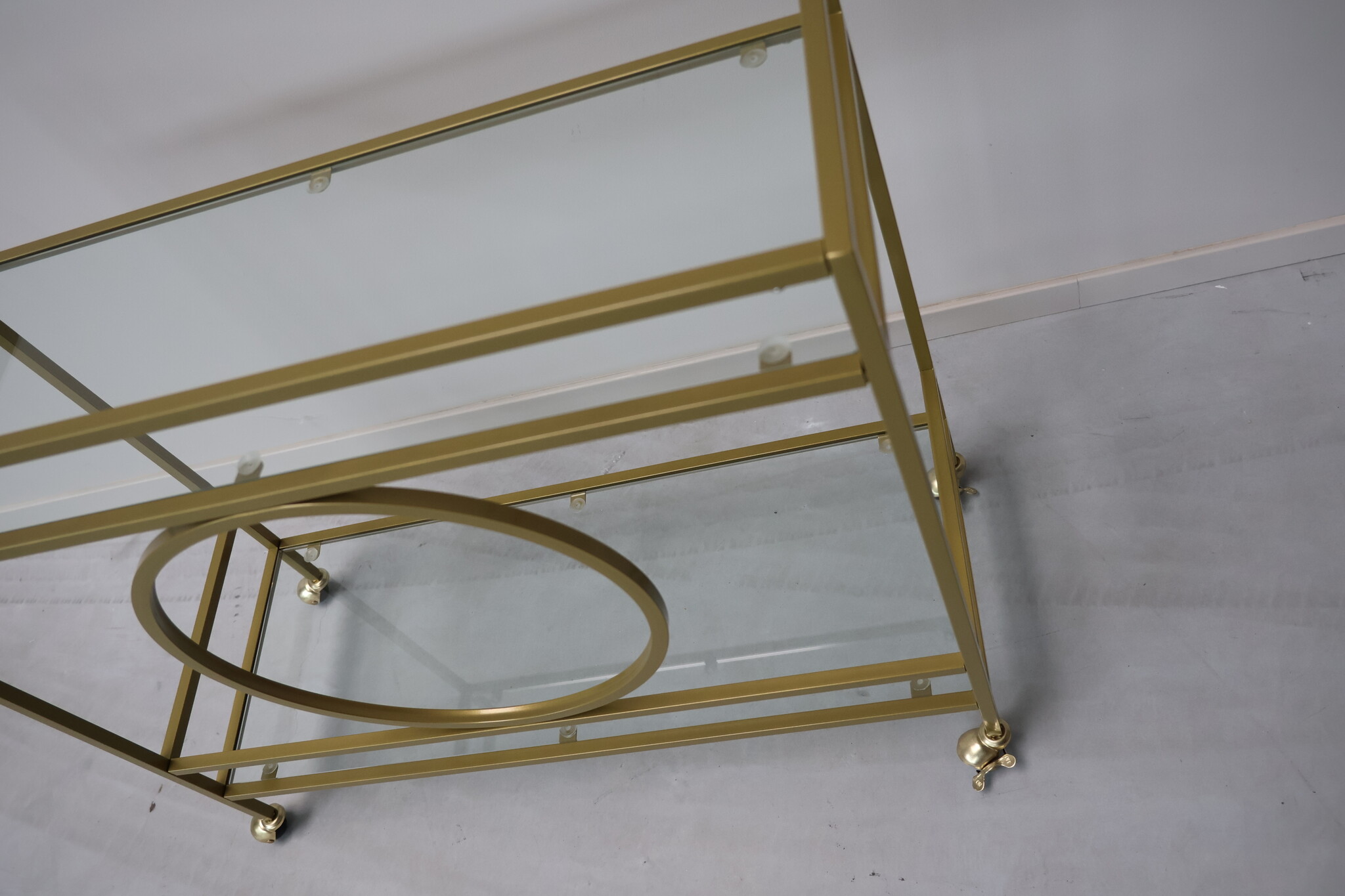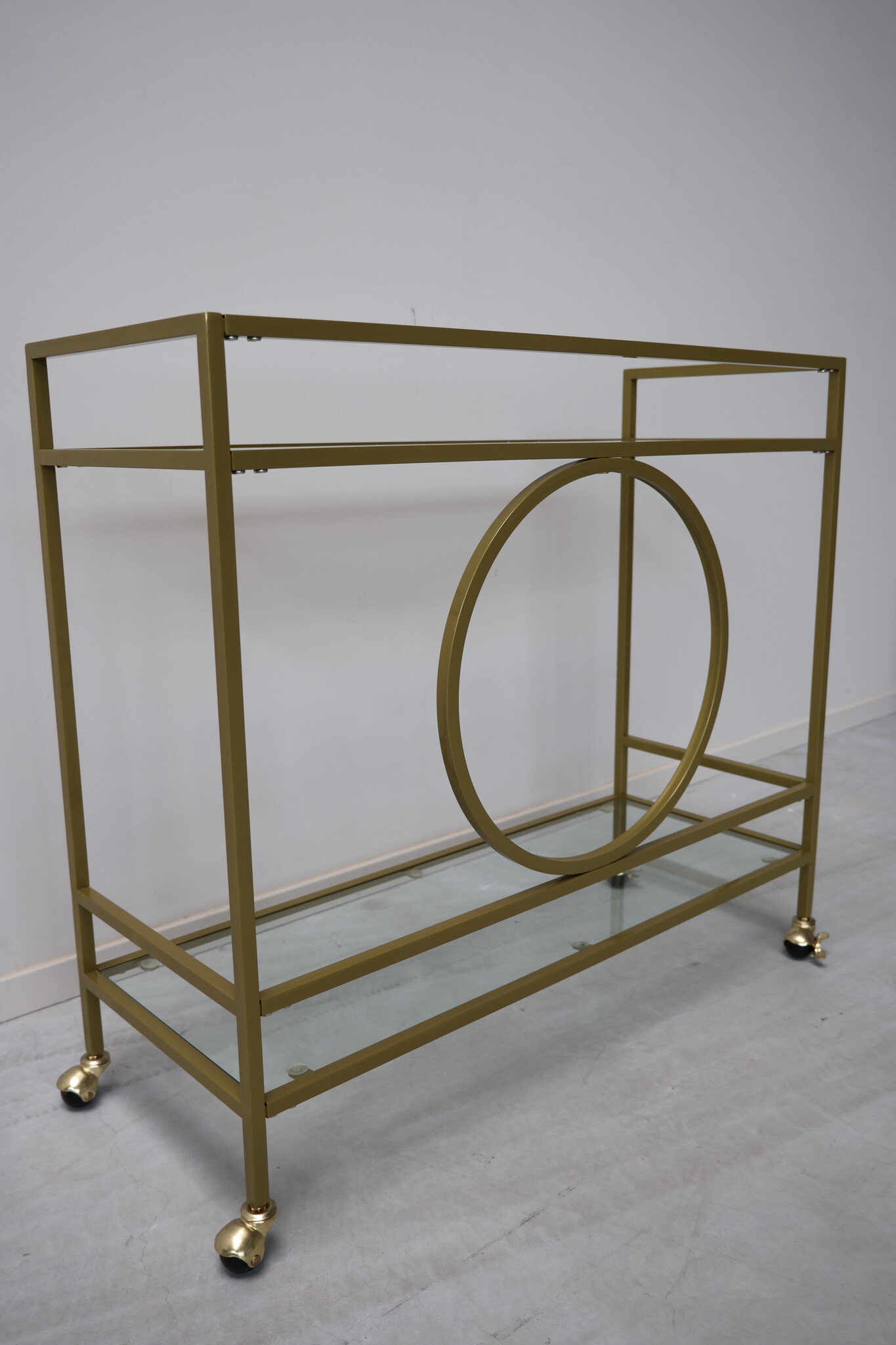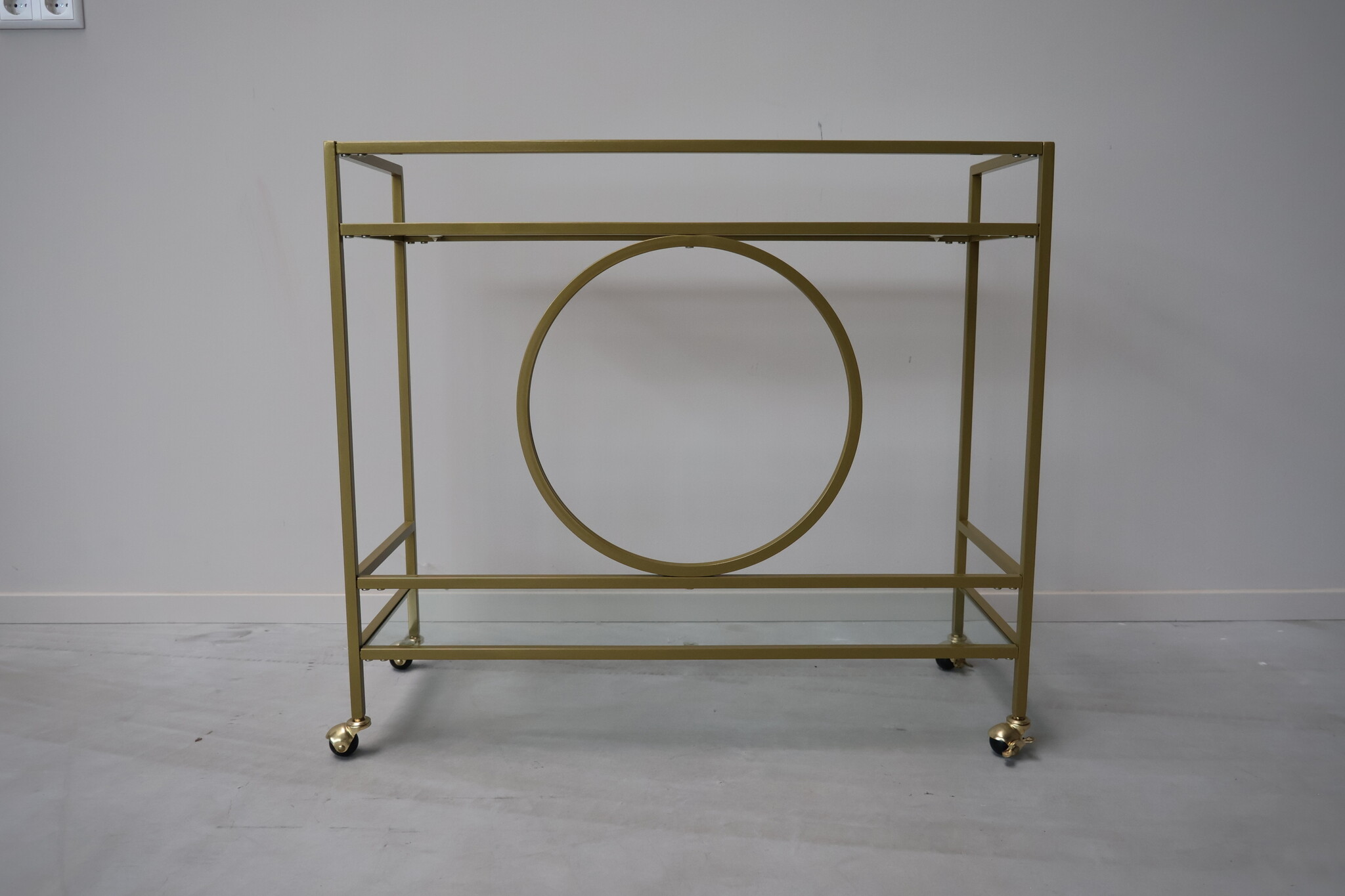 Dit exemplaar betreft een showroommodel met lichte gebruikssporen en is direct leverbaar. Het gouden design geeft de trolley een luxe uitstraling, waardoor het een opvallend en stijlvol element in elk interieur vormt.